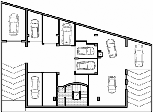 Il piano è diviso in due settori, ognuno munito di rampa d'accesso autonoma; il primo ospita 8 box auto di cui uno collocato in estensione della rampa di accesso ed è direttamente collegato con il vano scale e ascensore. Il secondo settore è privato, riservato ai proprietari dell'appartamento 3.